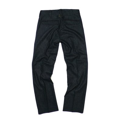 こちらのアイテムは、撥水加工を施したストレッチツィードを採用し、パイピングには本革を使用するなど贅沢なデザインのパンツとなっております。とても軽量ながら保温性が高く、裏地にはストレッチタフタを採用することでサラリとした肌触りで快適にご使用いただけます。ウォレットチェーンやカラビナなどの取り付けに便利なDカンやトラッド感を演出する尾錠など細かい部分にもこだわりの行き届いたアイテムとなっています。