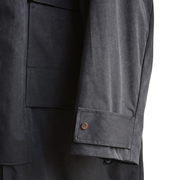こちらは、上質なモールスキンのような起毛感のあるナイロン60%、ポリエステル40%の超高密度ナイロン素材を使用したコートで、一枚ものですが優れた防風性、撥水性を備え外に熱を逃がし難いので保温性にも優れています。さらにワイドシルエットなので中に厚手のニットやライトダウンを着込むことが可能です。