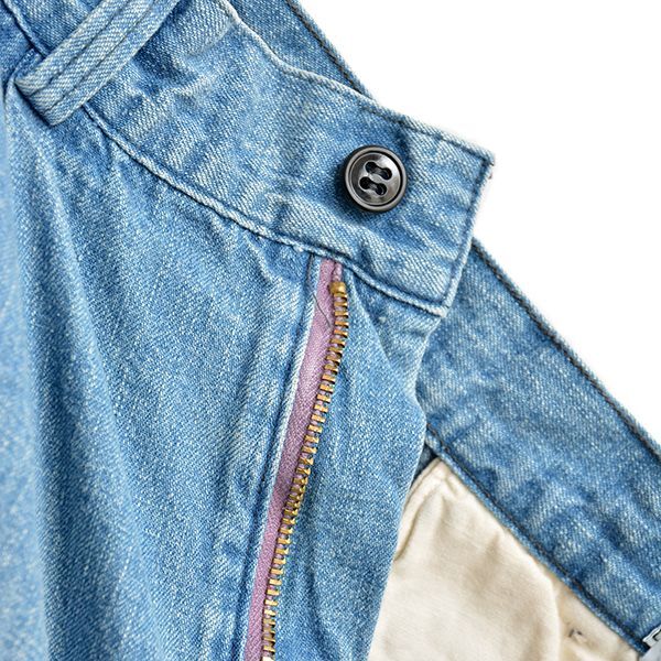 こちらは、暑い夏でも快適な薄手で軽いデニムを使用したパンツで、2タックを入れることで腰回りにゆとりを持たせ、適度にテーパードを掛けたワイドシルエットのパンツになります。