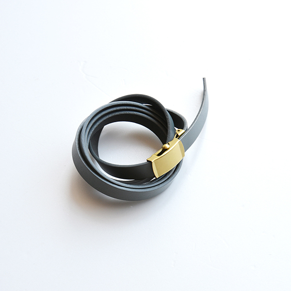 こちらは、シンプルなレザーのガチャベルトで、少し細めのベルトや脱着可能なブラスのバックルがカジュアルですが、大人の落ち着きを感じるベルトに仕上がっています。