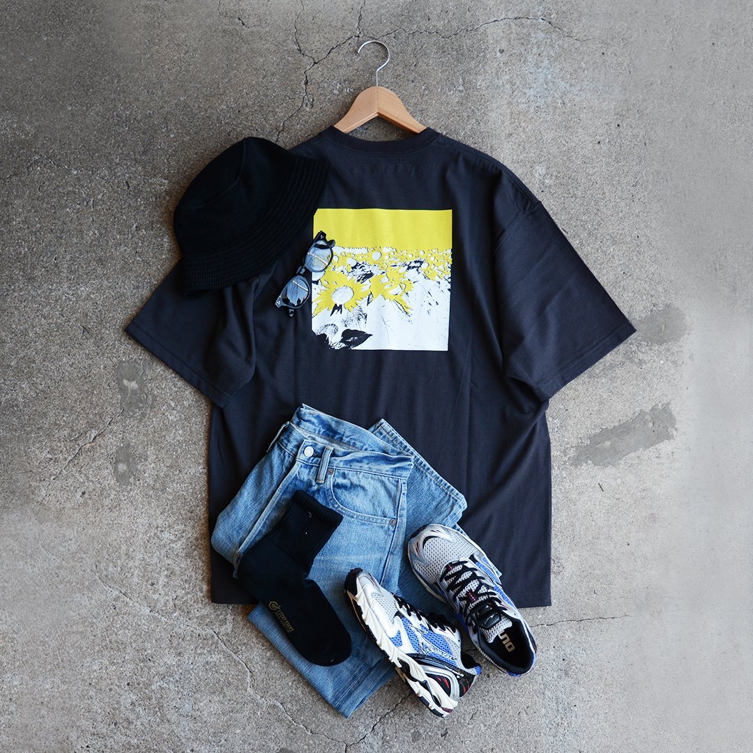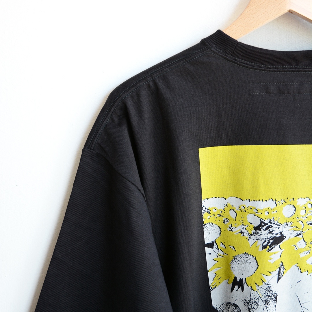 胸プリントには今シーズンのテーマ”Like a movie”、背面は、わざとプリント版をずらすことで、2色版なのにボディカラーが相まって3色に見えるようプリントされた”ひまわり畑”になっています。