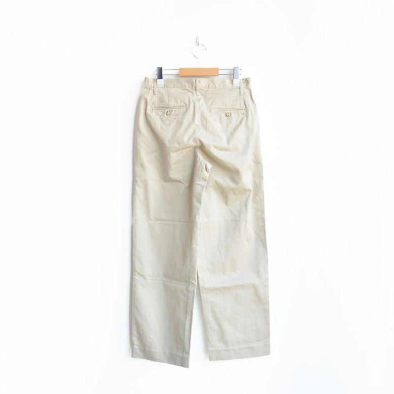 ジャストサイズでもオーバーサイズでも合わせやすいチノパンで、サンダルから革靴まで幅広く合わせていただけます。