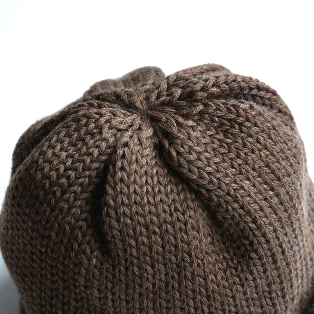 こちらは、3ゲージの太番手糸を使用して袋編みで作られたスタンダードなニットキャップで、ボリューム感がありながら誰でも被りやすいバランスにデザインされています。