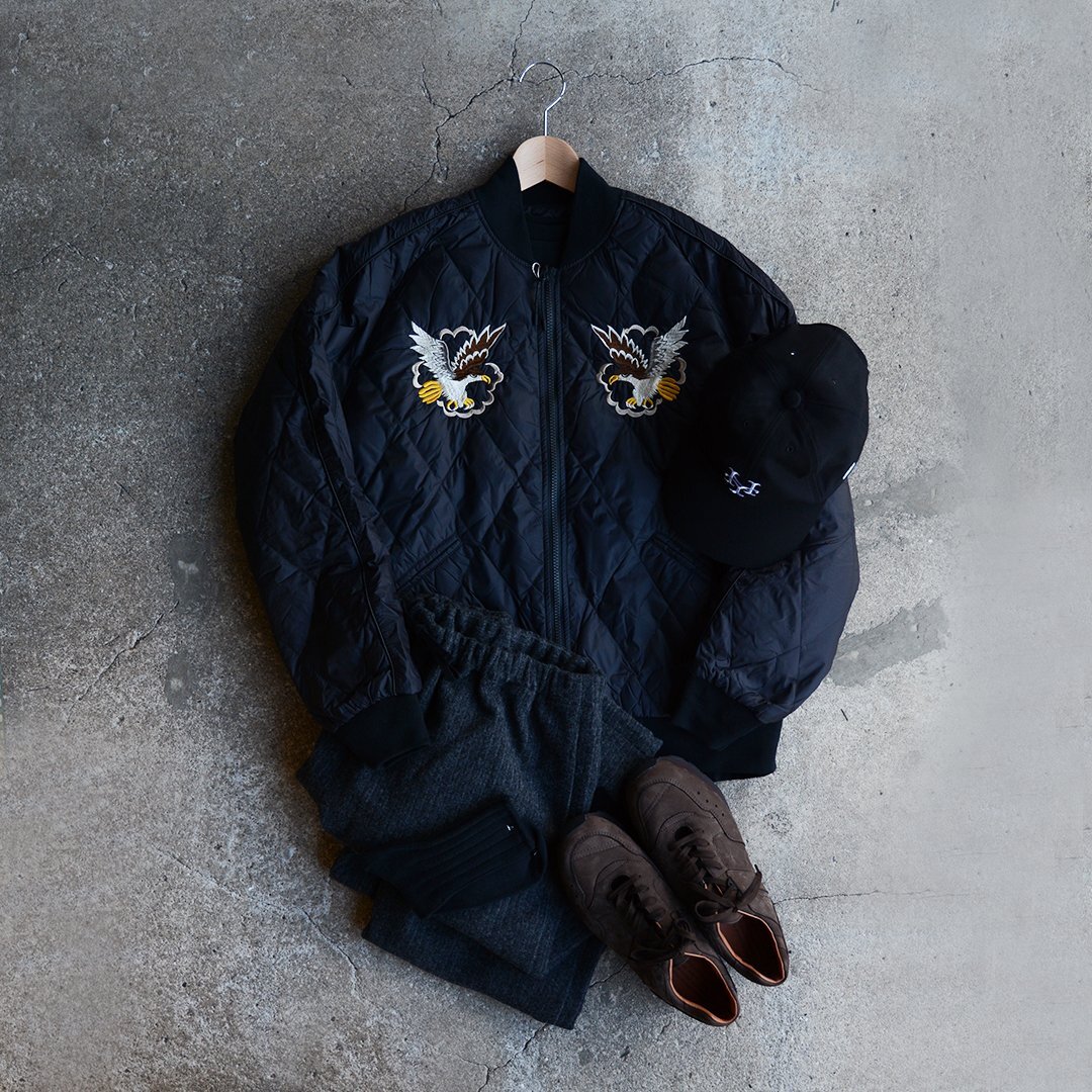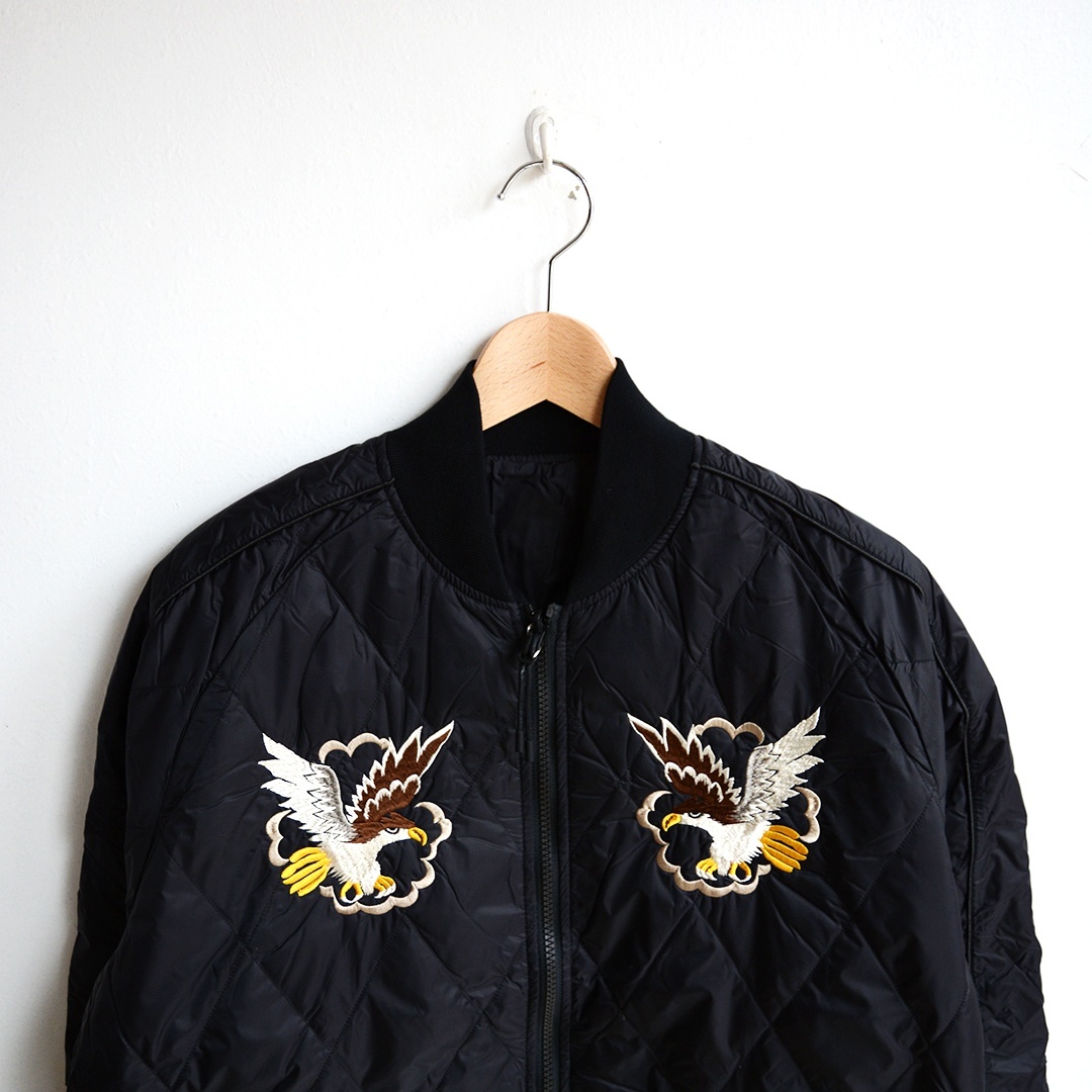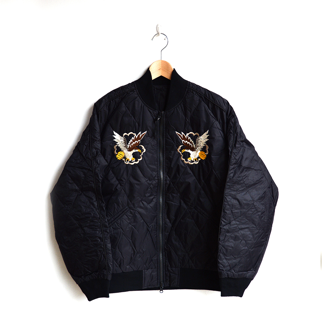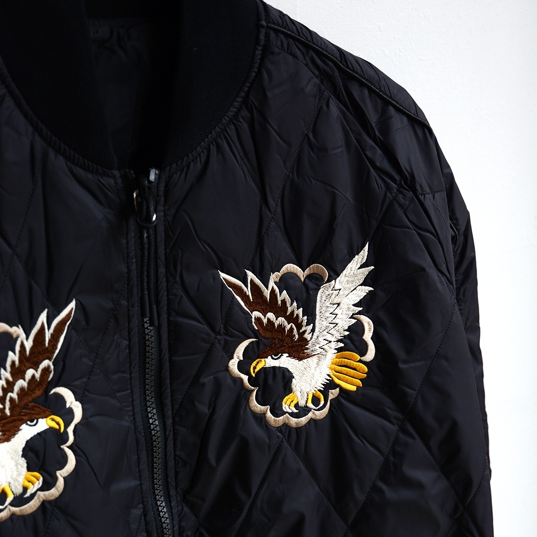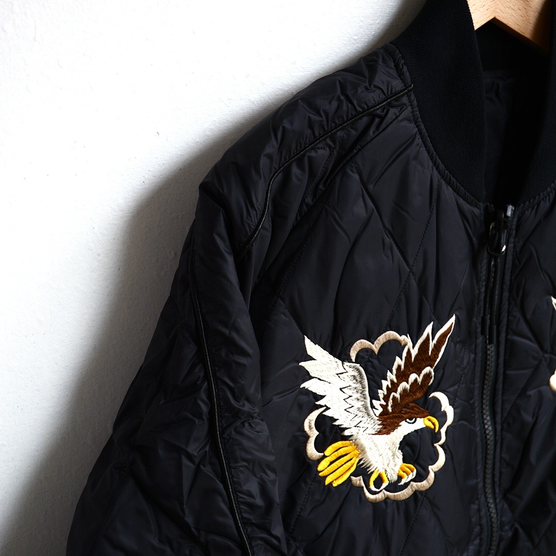 こちらは、軽くて柔らかく着用感にもこだわったジャンパーになっています。片側はダイヤキルトで左右の胸に鷲を背面には龍の刺繍を施したスカジャン仕様、片側はオールブラックのナイロンジャケットで、その日の気分でリバーシブルに着用できるアイテムです。
