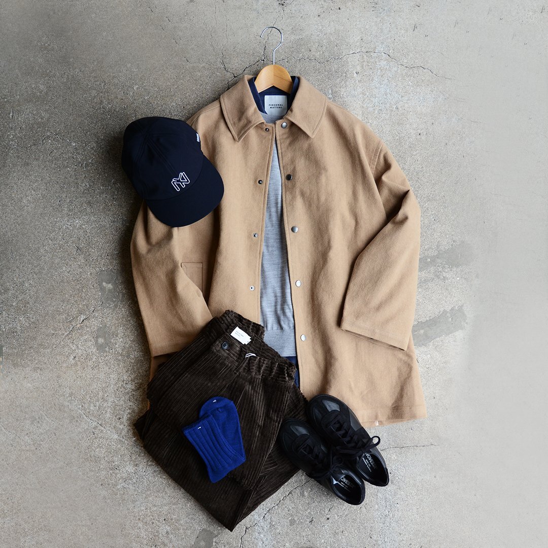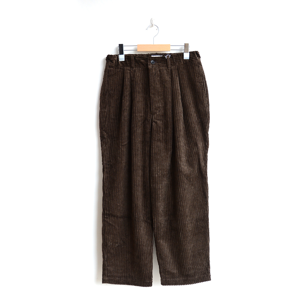 こちらは、縦方向にボリュームが出るようなタックの取り方で適度な中太シルエットのパンツですが、柔らかく落ち感のある素材がすっきりと見えるコーデュロイパンツです。