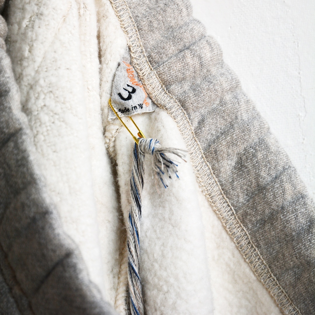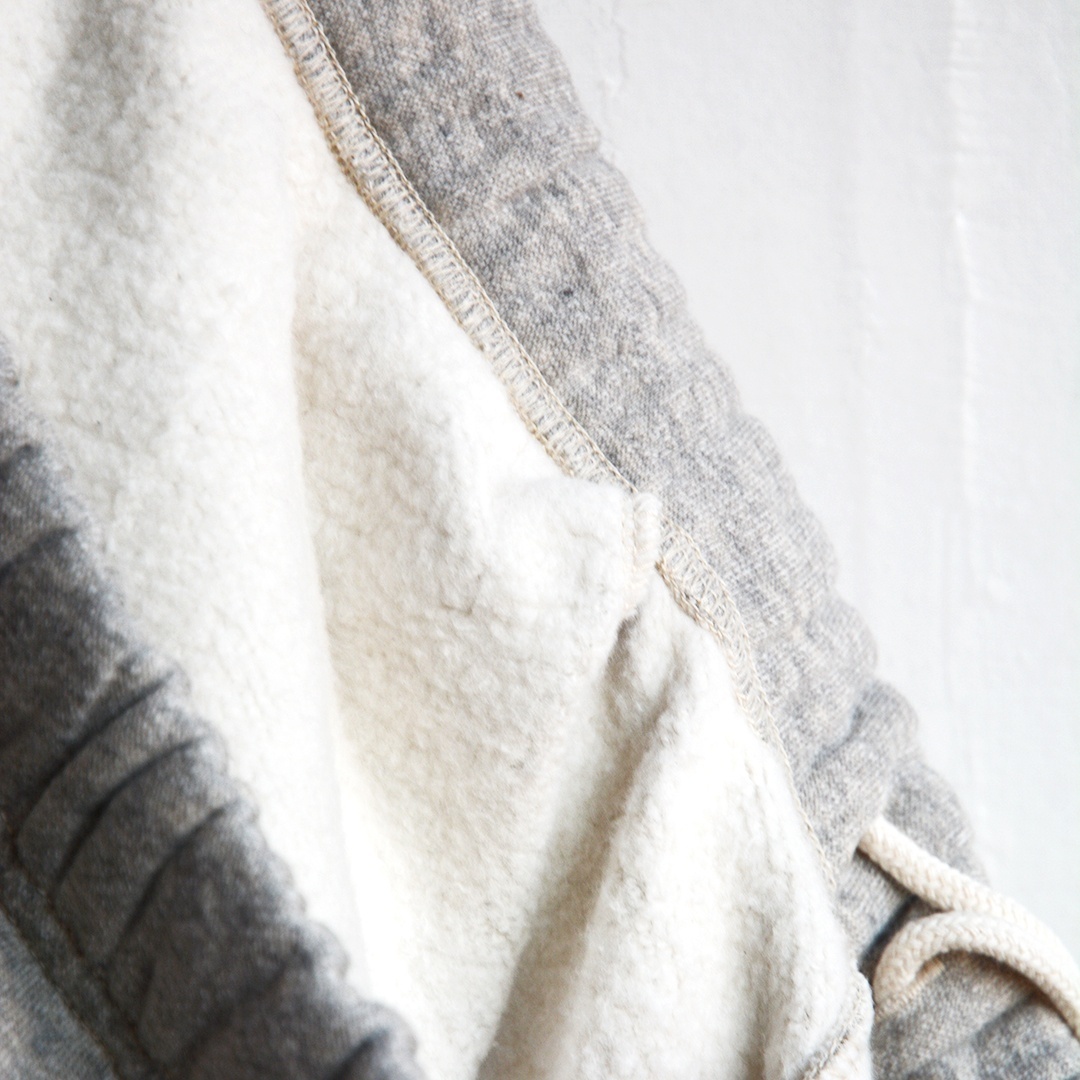 こちらは、シーアイランドコットンの種子をアメリカで無農薬栽培し、出来上がる綿「アルティメイトピマ」を表糸に採用、中・裏糸も同様にオーガニックなものを使用し、吊り編みでゆっくりと時間をかけて編み立てたオーガニック100%の裏毛素材を使用したスウェットパンツになります。