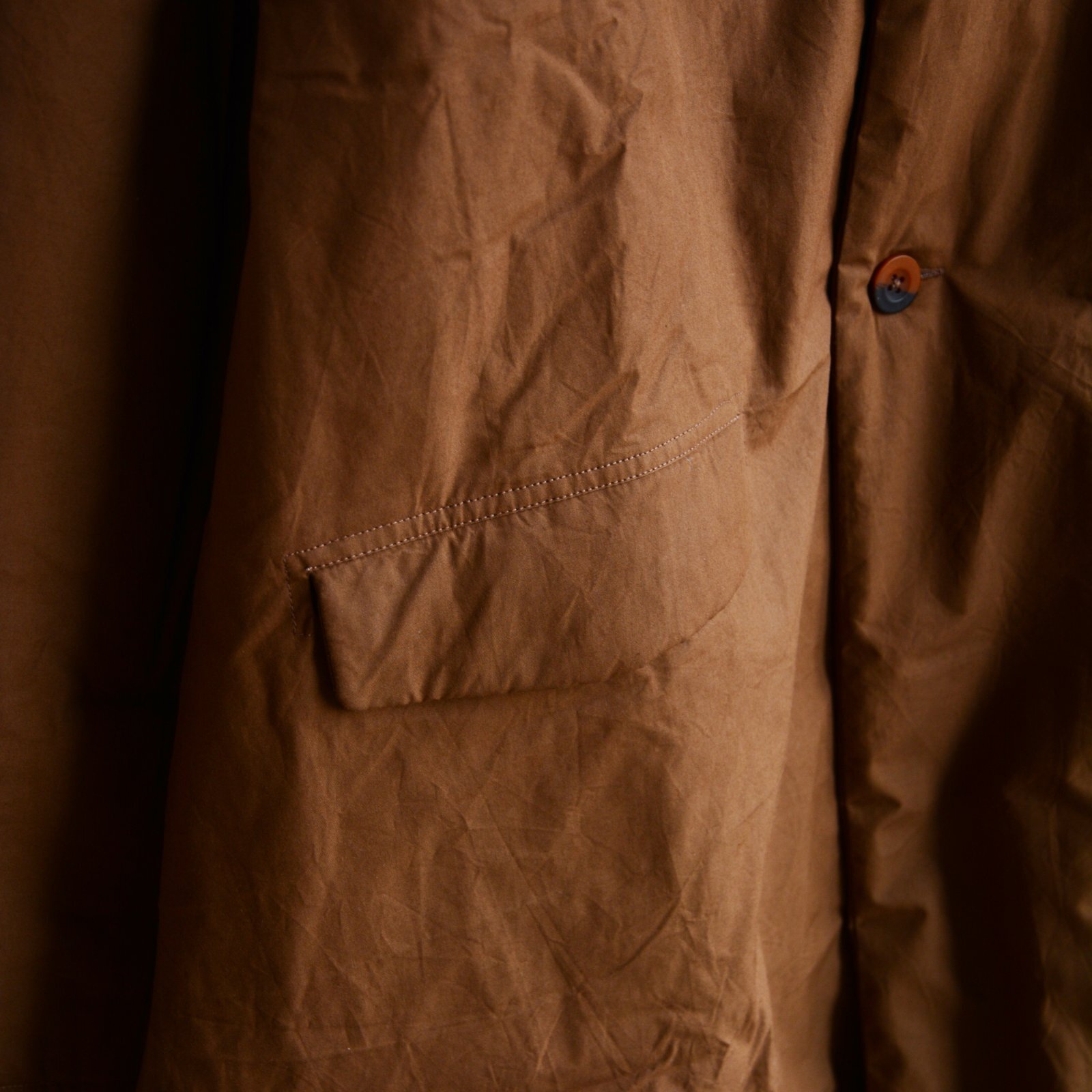 こちらは、シンプルなデザインですが、立ち上げて着られるフラットカラーや、ボタンで留めるフロントのミニマルな仕様がさりげない個性を持つコートです。
