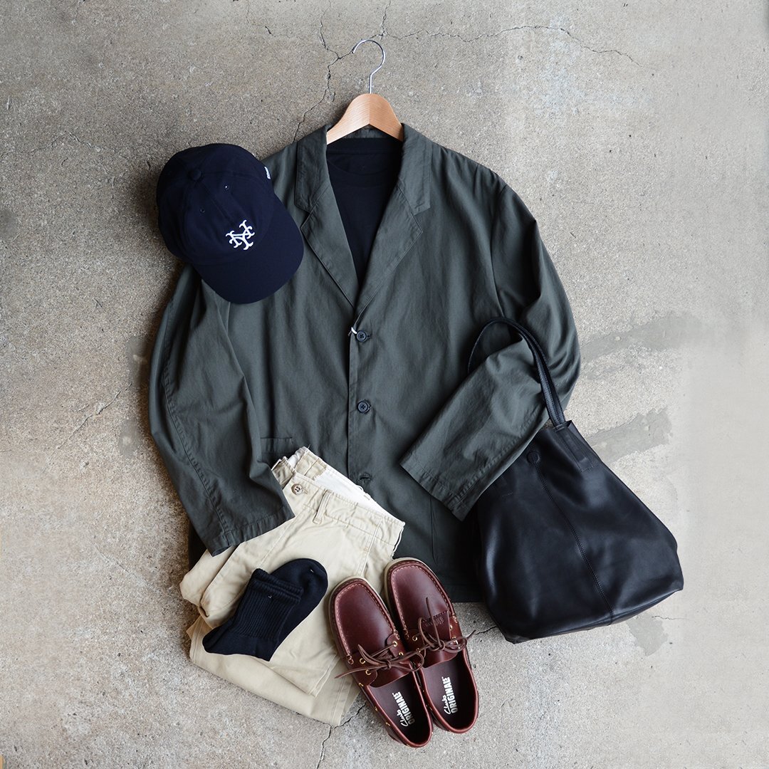 こちらは、強撚糸で綾組織の素材を使用しているので、落ち感がしっかり出るため、リラックスしてゆったり羽織れるジャケットです。