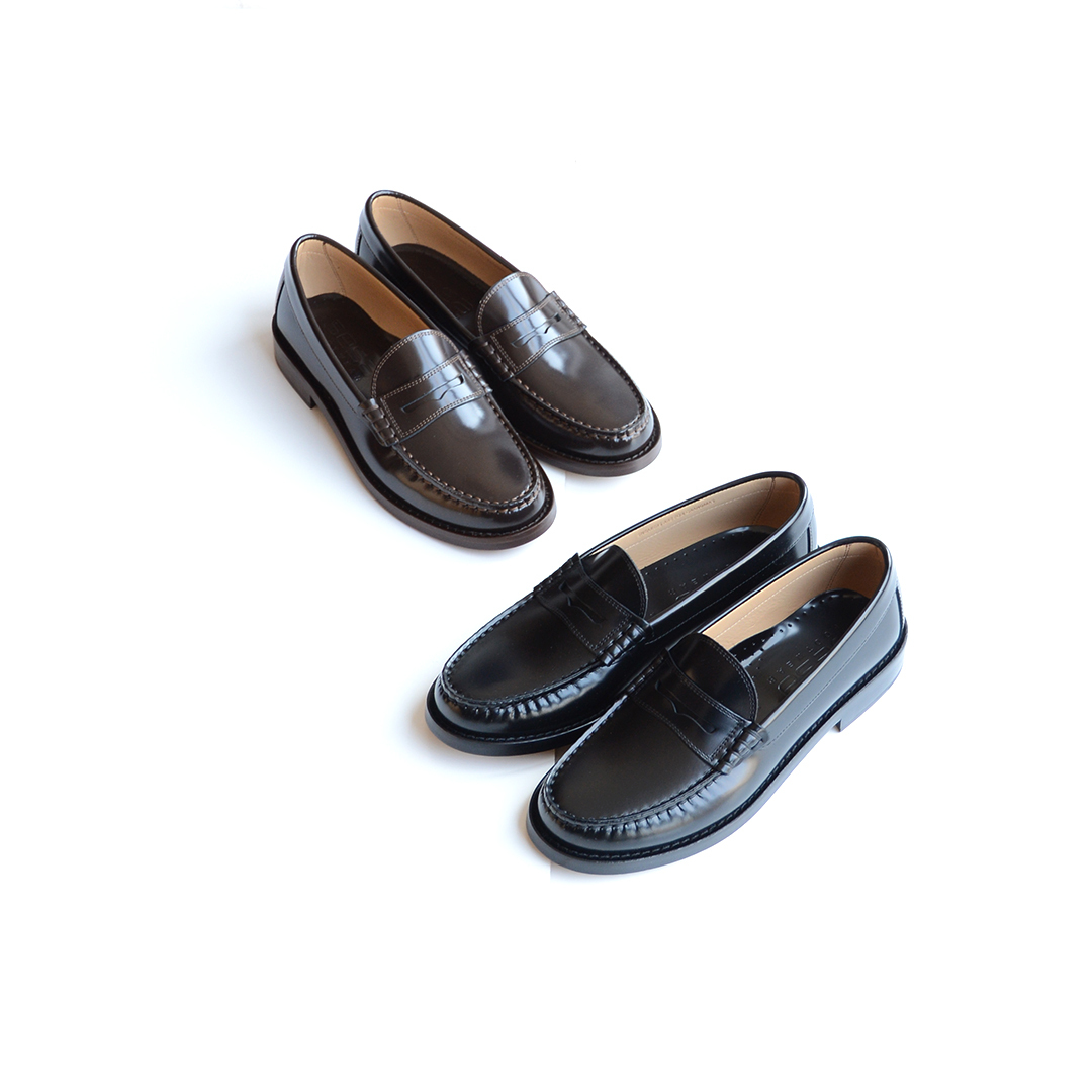 こちらは、艶やかな光沢が美しいガラスレザーを使用したローファーで、ビーフロールながら無骨にならないクセのない美しいフォルム、丁寧に施された各所の縫製も美しいシューズに仕上げられています。