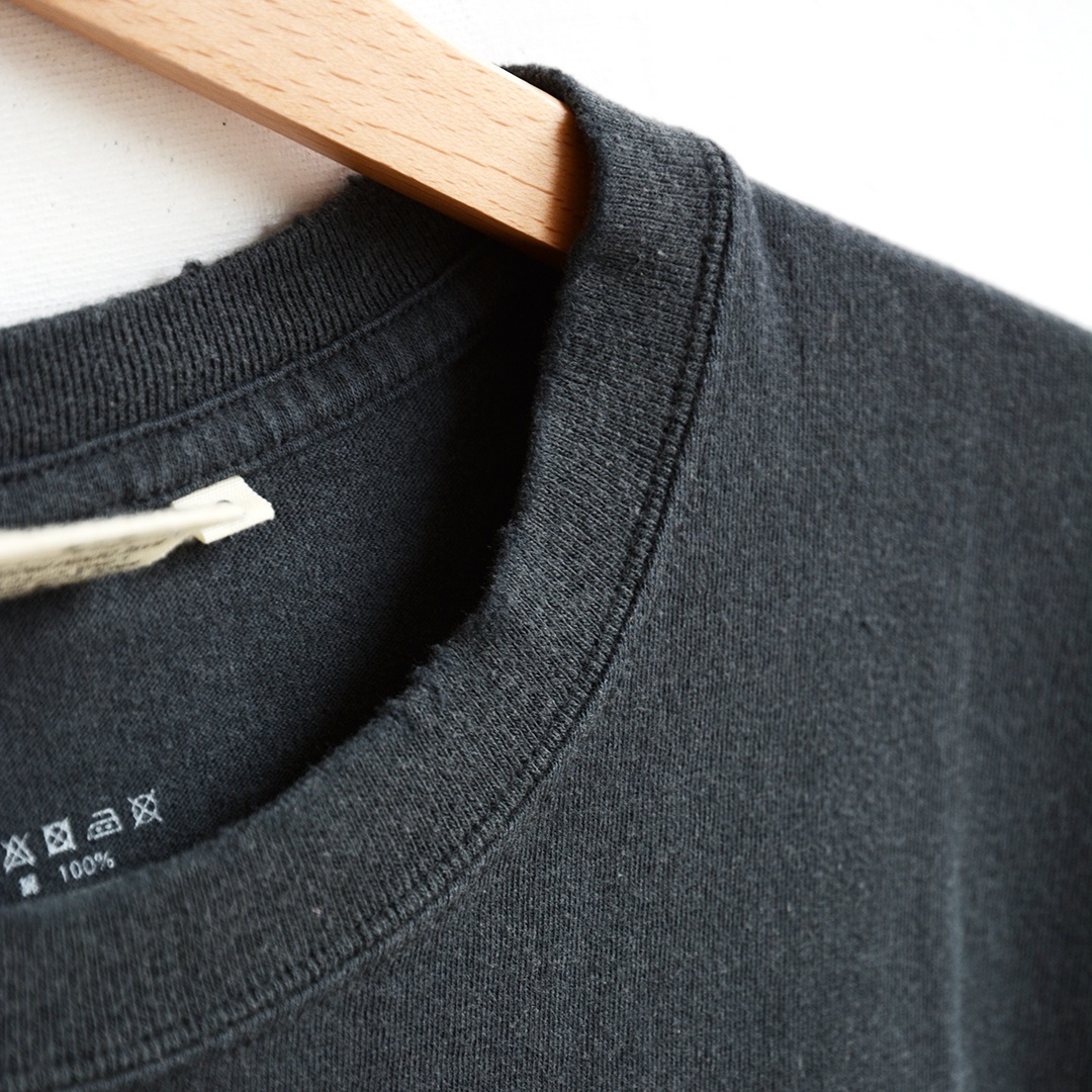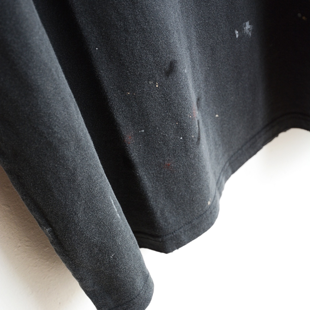 こちらは、ヴィンテージのスーベニアTシャツから着想されたTシャツで、ボディ全体に施されたペイント加工、油汚れ加工、襟、裾のほつれ加工、プリントのクラッキング加工など、何十年も着続けているような自然な風合いが表現されています。