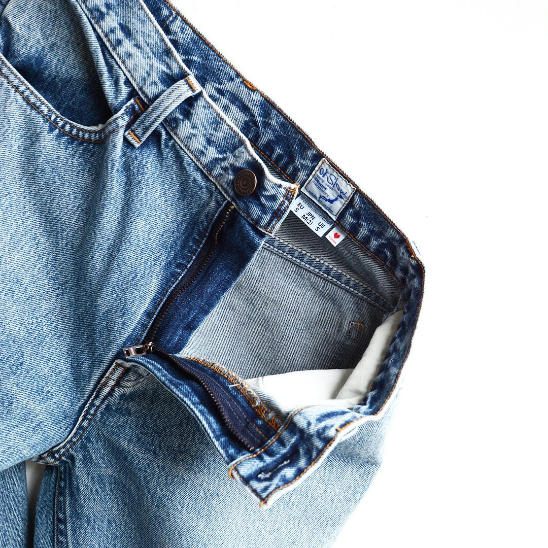こちらは、自然な風合いにヴィンテージ加工されたヴィンテージライクなデニムで、腰回りからワタリにかけてはジャストサイズ、裾に向かって自然にフレアさせた70’sのヴィンテージデニムをサンプルに作られたデニムになります。